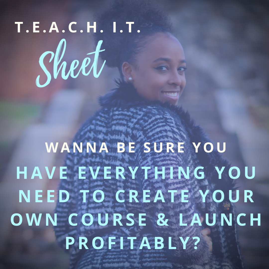 So, I created this powerful method, and then I put it all into one comprehensive guide I call “The TEACH IT Sheet” to help new course creators (just like you!) plan and launch their courses easily and effectively, in less time - without the overwhelm.